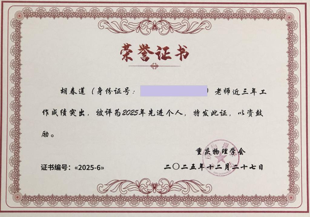 在材料科学与工程学院党委书记周平带领下,大学物理课程组7名教师参加了此次会议。会上,材料科学与工程学院教师胡春莲教授凭借在大学物理教学改革中的突出贡献,特别是在数字化教学创新、智能教学竞赛促进学习等方面的积极探索,获得了专家的一致认可,荣获重庆市物理学会颁发的“先进个人”称号。